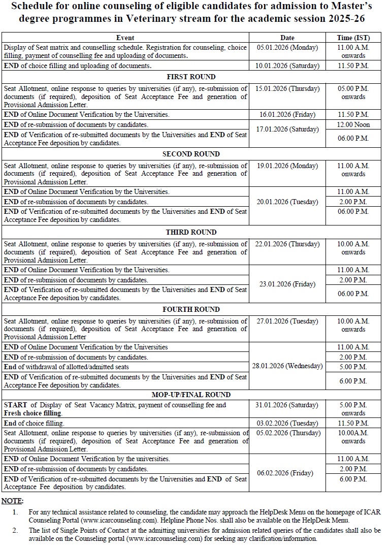 The candidates are advised to visit ICAR’s Portal (https://icar.org.in/) or the website of the Agricultural University of their interest for more information.