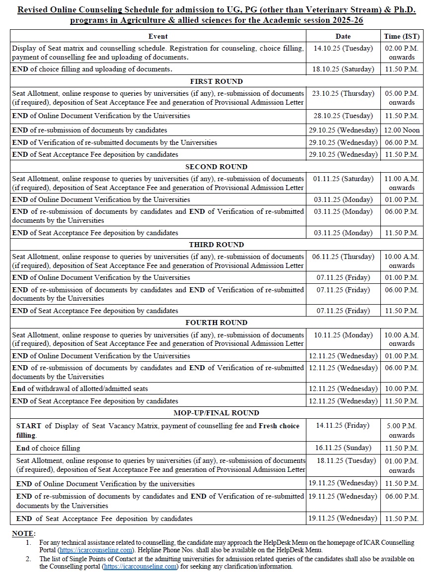 The candidates are advised to visit ICAR’s Portal (https://icar.org.in/) or the website of the Agricultural University of their interest for more information.